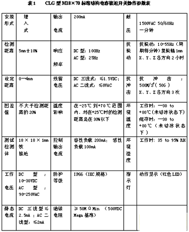 電容式接近開關屬于一種具有開關量輸出的位置傳感器,它的測量頭通常構(gòu)成電容器的一個極板,而另一個極板是物體的本身,當物體移向接近開關時,物體和接近開關的介電常數(shù)ε發(fā)生變化,使得和測量頭相連的電路狀態(tài)也隨之發(fā)生變化,由此便可控制開關的接通和關斷。被這種接近開關的檢測物體,并不限于金屬導體,也可以是絕緣的液體或粉狀物體,在檢測較低介電常數(shù)ε的物體時,可以順時針調(diào)節(jié)多圈電位器(位于開關后部)來增加感應靈敏度,一般調(diào)節(jié)電位器使電容式的接近開關在0.7-0.8Sn(Sn為電容式接近開關的標準檢測距離)的位置動作。這里選用的是浙江省洞頭縣光電開關廠生產(chǎn)的CLG型M18×70標準結(jié)構(gòu)的開關。它的外型圖與尺寸標示圖分別如圖1與圖2所示。