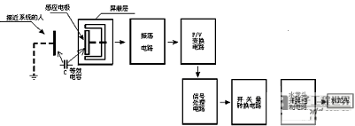 系統(tǒng)組成框圖如圖3所示,從框圖可以看出控制信號的流程:當人或其它物體接近電容式接近開關時,等效電容的容量值會發(fā)生變化,從而改變LC振蕩器的振蕩頻率,F(xiàn)/V電路將LC振蕩器輸出的頻率量轉(zhuǎn)化成電壓量后,交給信號處理電路,該部分將電壓信號進行一系列的處理(包括:放大、整形等)后傳給開關量變換電路,開關量轉(zhuǎn)換電路實際上是A/D轉(zhuǎn)換器,它將模擬電壓轉(zhuǎn)換為數(shù)字量,水龍頭控制電路由開關量轉(zhuǎn)換電路的輸出量控制,它產(chǎn)生控制信號控制水龍頭的開與關。本系統(tǒng)設計成當人接近水龍頭一定距離時,水龍頭自動開啟,離開一定距離后水龍頭自動關閉。