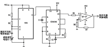 連線圖如圖4所示,由555定時器組成的振蕩器,它的振蕩頻率為:f=1/0.69*(R1+2*R2)*(C//CT),C就是電容式接近開關的等效電容值,CT為頻率調(diào)節(jié)電容,通過C的變化從而使振蕩頻率變化,將此種變化傳給F/V電路,引起F/V電路的輸出電壓變化。由鎖相環(huán)CD4046組成的F/V變換電路將頻率值變成電壓值后,經(jīng)精密運放OP-07線性放大后輸入到開關量轉(zhuǎn)換器(A/D轉(zhuǎn)換器)的輸入端。