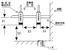 安裝要求示意圖如圖5所示,圖中S1表示檢測面與支架的間距,要求≥1Sn,S2表示檢測面與背景的間距,要求≥3Sn,S3表示并列安裝間距,要求≥5Sn,S4表示檢測面與側(cè)壁的間距,要求≥3Sn。(Sn為電容式接近開關的標準檢測距離)