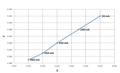 使用減小電流的方法進(jìn)行LED調(diào)光類似于大多數(shù)白熾燈泡使用的調(diào)光方法。這種減小電流的方法在為數(shù)不多的應(yīng)用中可以接受,但隨著光等級(jí)降低,LED發(fā)出的光色彩也根據(jù)電流而變化。電流較小時(shí),色度(Chromaticity)朝向黃色變化。圖1顯示不同電流時(shí)的典型色度變化。