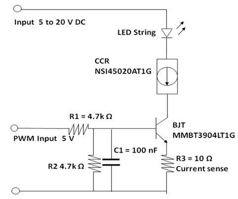 采用簡(jiǎn)單的CCR及雙極結(jié)晶體管和PWM訊號(hào)控制的LED能夠輕易地調(diào)光至汽車及建筑物照明應(yīng)用要求的精度。使用雙極結(jié)晶體管使LED能夠以恒定電流驅(qū)動(dòng),從而不會(huì)有色度變化;光的色彩仍然保持一致,僅是LED發(fā)射的光量減小。
