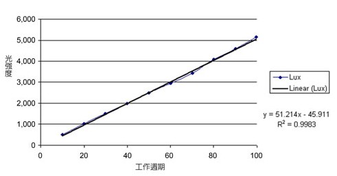 控制訊號(hào)的工作頻率為300Hz,脈波寬度為30微秒(μs)。隨著脈波寬度增加,LED導(dǎo)通的總時(shí)間也會(huì)延長(zhǎng),并提升光輸出。在脈波接近零電平時(shí),光輸出也將接近零。圖5顯示不同工作周期條件下的流明輸出曲線。