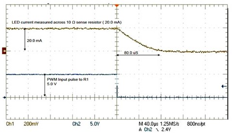在LED導(dǎo)通期間,流經(jīng)LED的電流保持恒定,使LED發(fā)射的光恒定,且無色度(色彩)變化。亮度與LED導(dǎo)通時(shí)間所占的百分比成正比。