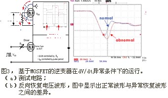 通常,增加?xùn)艠O阻抗會(huì)降低MOSFET的開關(guān)速度。在如圖3(a)所示的半橋電路中,如果高壓側(cè)MOSFET的柵極阻抗 (在HVIC中實(shí)現(xiàn)) 大,將會(huì)存在一定的短路電流;這個(gè)電流是上面那個(gè)MOSFET導(dǎo)通時(shí)的密勒電容Cgd感應(yīng)產(chǎn)生的,不嚴(yán)重時(shí)一般不會(huì)察覺。但是,正如圖3(b)所示,這種異常行為會(huì)增加逆變開關(guān)的損耗 (導(dǎo)通損耗),并最終減弱系統(tǒng)的額定功率和穩(wěn)定性。在這樣的瞬態(tài)過程中,要降低開關(guān)速度,同時(shí)又不失穩(wěn)定性,上方那個(gè)MOSFET的Vgs應(yīng)小于閾值電壓Vth。換句話說,最好通過調(diào)節(jié)HVIC的關(guān)斷阻抗來保證系統(tǒng)的穩(wěn)定性,防止因電壓變化而感應(yīng)短路電流。但這會(huì)增加MOSFET的關(guān)斷dV/dt值。