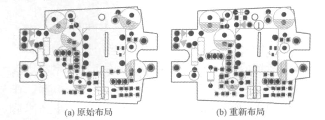 從圖4中可以看出在2 MH z頻率點(diǎn)附近最大超出為5 dBuV.為保證能夠順利通過(guò)認(rèn)證機(jī)構(gòu)的實(shí)驗(yàn)室測(cè)試, 一般要求預(yù)測(cè)試結(jié)果比標(biāo)準(zhǔn)限制低2 dBuV,希望盡量能夠比標(biāo)準(zhǔn)限值低6 dBuV.所以從圖4可知該產(chǎn)品的預(yù)測(cè)試結(jié)果并不理想。初步分析測(cè)試圖,可能性最大的原因是開關(guān)管工作時(shí)產(chǎn)生的干擾把2MH z頻率點(diǎn)附近的噪聲電平底部懸空, 從而把傳導(dǎo)干擾的電平抬高。而在傳導(dǎo)發(fā)射測(cè)試中, 1 MH z~2MH z的頻率信號(hào)干擾是由共模電流產(chǎn)生的占主要分量[ 10] .所以初步定性為電流回路對(duì)參考地形成的干擾信號(hào)。為了能夠一次性解決問(wèn)題以達(dá)到標(biāo)準(zhǔn)限值要求, 把可能出現(xiàn)問(wèn)題的地方都加以改進(jìn), 本研究提出了解決方案: ①按照上述措施對(duì)線路板進(jìn)行重新布局, 原始布局如圖5( a)所示, 圖中布局雖然按照主電流流向排布, 但缺乏考慮各個(gè)子路之間的相互關(guān)系。重新布局如圖5( b)所示, 在無(wú)法改變PCB板的結(jié)構(gòu)下, 盡可能地將器件排列整齊, 方向一致, 同時(shí)增大開關(guān)管與變壓器之間距離。② 變壓器初級(jí)增加并聯(lián)旁路濾波電容, 并聯(lián)電容值為1 000 pF /1 kV, 用來(lái)降低干擾信號(hào)對(duì)共模電流回路產(chǎn)生的影響。