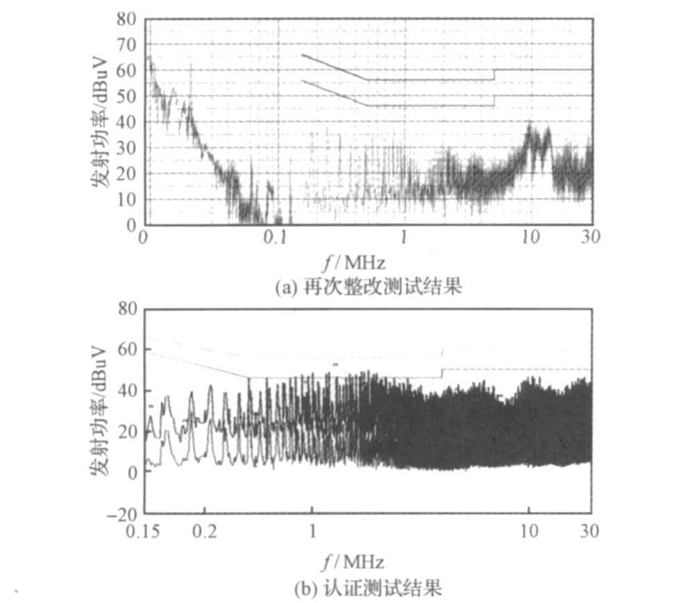 從預(yù)測(cè)試的結(jié)果圖7( a)中可以明顯地看出干擾信號(hào)幅值都比標(biāo)準(zhǔn)限值都要低6 dBuV 以上, 這樣基本能確保一次性通過(guò)認(rèn)證機(jī)構(gòu)專用實(shí)驗(yàn)室的檢測(cè)。由寧波進(jìn)出口檢驗(yàn)檢疫局EMC 實(shí)驗(yàn)室提供的測(cè)試結(jié)果如圖7( b)所示。該結(jié)果表明產(chǎn)品已經(jīng)順利通過(guò)測(cè)試。