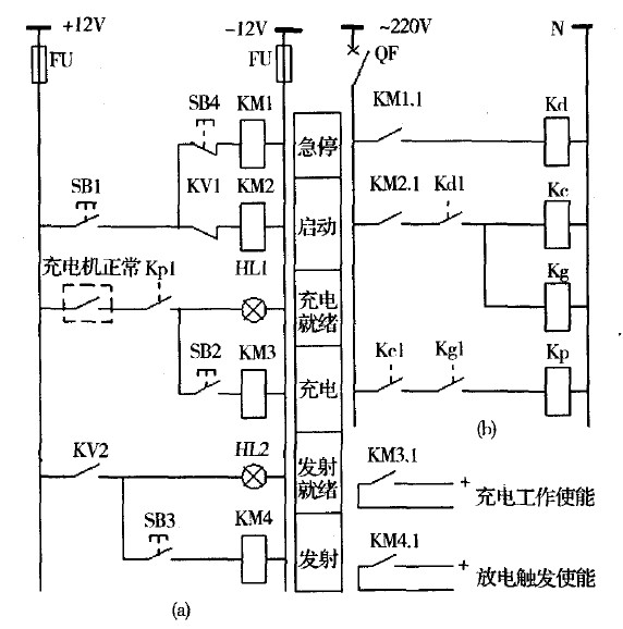 圖3(a)中,KM1-4為SSR,SB1-4為自鎖按鈕。系統(tǒng)上電后,通過(guò)按鈕SB1啟動(dòng)KM1和KM2,這樣Kd將首先得電動(dòng)作,隨后Kc、Kg、Kp也相繼動(dòng)作,為下一步進(jìn)行的充電工作做好了準(zhǔn)備。圖3(b)中,Kc和Kg啟動(dòng)采用了位置接點(diǎn)Kdl,同樣Kp啟動(dòng)也采用了位置接點(diǎn)Kcl和Kgl,這樣設(shè)計(jì)目的是使控制電路具有了邏輯動(dòng)作與防誤閉鎖功能。此時(shí)只要充電設(shè)備自檢正常(圖3(a)中"充電機(jī)正常"接點(diǎn)閉合),則燈HI 1指示可以進(jìn)行充電,通過(guò)按鈕SB2啟動(dòng)KM3便可對(duì)脈沖電容器組進(jìn)行充電。脈沖電容器電壓達(dá)到預(yù)設(shè)值后,KV動(dòng)作,常閉接點(diǎn)KV1斷開(kāi)致使KM2失電,則Kc、Kg、Kp相繼返回,同時(shí)Kp返回又使KM3失電,這樣Kc、Kg斷開(kāi),充電機(jī)停止工作,滿足了系統(tǒng)放電前提。此時(shí)燈HL1熄滅、KV2接通,燈HL2指示充電完畢,通過(guò)按鈕SB3啟動(dòng)KM4則可進(jìn)行ETCG發(fā)射。