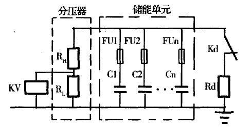 脈沖電容器儲(chǔ)能后,由控制電路發(fā)送命令進(jìn)行觸發(fā)放電(ETcG發(fā)射)。ETCG發(fā)射精度和一致性與PPS儲(chǔ)能量密切相關(guān),電容器儲(chǔ)能大小與其充電電壓的量值平方成正比,因此控制電路必須能精確控制充電電壓量值,這可以通過(guò)與被充電容器組并聯(lián)"分壓器一電壓繼電器組"來(lái)實(shí)現(xiàn),見(jiàn)圖2。