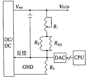 液晶顯示器對比度的調(diào)節(jié)可分為硬件調(diào)節(jié)和軟件調(diào)節(jié)。圖5的電路具有軟、硬件調(diào)節(jié)功能。其中R1是可調(diào)電阻,可調(diào)節(jié)VLCD的電壓,從而液晶顯示器的對比度得到調(diào)節(jié);電路中還可利用CPU與數(shù)模轉(zhuǎn)換器(DAC)相結(jié)合來控制DC/DC的反饋端的電壓,從而實(shí)現(xiàn)軟件調(diào)節(jié)液晶顯示器的對比度。