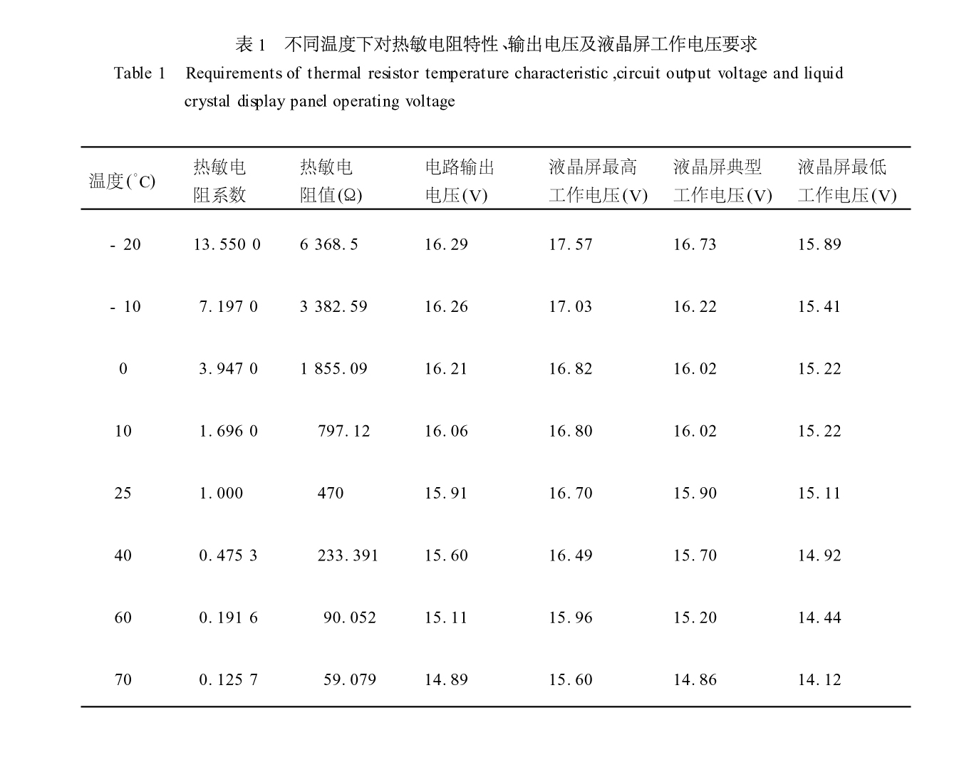 進(jìn)行了模擬計(jì)算,結(jié)果如表1,由表1所得曲線如圖4。表1和圖4表明電路輸出和液晶屏的要求吻合,電路能夠保證液晶在-20~70°C 范圍內(nèi)正常顯示。而且高、低溫測試結(jié)果證實(shí),在-20~70 °C范圍內(nèi)對比度正常。