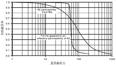 此外,電感磁芯材料也是選擇電感時應(yīng)該加以考慮的重要因素。常用的磁芯材料分為兩大類,一類是粉狀磁芯,以鐵粉芯、High Flux高磁通磁粉芯以及Kool Mμ為代表;另一類是鐵氧體磁芯。兩種磁芯材料各有優(yōu)缺點,設(shè)計人員在選擇的時候,應(yīng)根據(jù)成本、性能、尺寸等因素綜合考慮進行選擇。相對粉狀磁芯電感,鐵氧體磁芯的電感具有較低的磁芯損耗,同時具有較高的開關(guān)頻率(高達MHz)。因此,鐵氧體磁芯通常是此類應(yīng)用的最佳選擇。當然,鐵粉磁芯也有其優(yōu)越性,例如鐵粉磁芯的成本相對鐵氧體要低得多;另外,粉狀磁芯的電感隨著流過電感的直流偏置電流的變大要下降得緩慢些,相當于具有“軟”飽和特性,而鐵氧體磁芯的電感值在飽和以后就會迅速下降(見圖1),因此在設(shè)計的時候需要留有更多的余量,防止電感出現(xiàn)飽和。如圖1所示,粉狀磁芯的電感值隨著負載電流的增大下降相對緩慢。鐵粉磁芯往往是用于一些對功耗要求不甚敏感,開關(guān)頻率也不高(<200kHz),但注重成本的應(yīng)用場合。