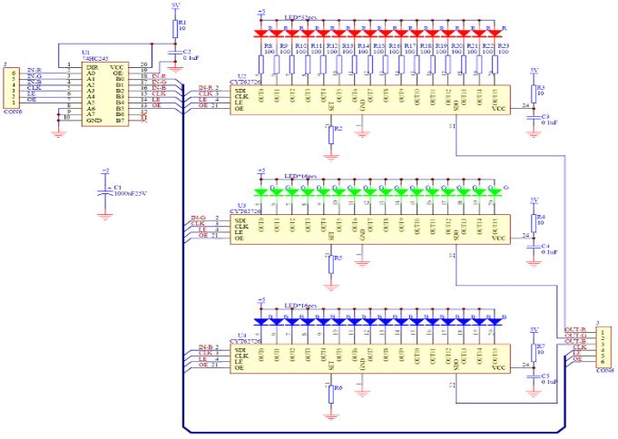 我們以一個led小模塊來分析其耗電狀況!如圖2,是一個以長運通光電推出的CYT62726為驅動芯片的led小模塊,其供電電壓為5V,先不計算外圍器件的功耗,因為它們在整個屏中所占的比重極小,那整個屏所耗的功率都在燈上,先計算燈點功率為Pled=n*Uvf*Iled(n為通道數(shù),Uvf為led燈點的壓降,Iled為設定的電流值)CYT62726驅動IC的管腳壓降一般為0.6V左右,紅綠藍燈點的壓降分別為1.8V,3.0V,3.0V如此那每個通道只需4V(3.0+0.6V)即可正常工作,保守一點可以設置成紅燈通道2.8V,藍綠通道3.8V而實際上我們的供電電壓都為5V,就相當于增加了1V*Iled的功耗在IC內(nèi)部,所以如上可以設想只要將供電電源下降至紅2.8V,綠3.8V,藍3.8V,我們就可以省去那加在IC通道上的1V*Iled功耗,在其他器件不變的情況下便可實現(xiàn)led顯示屏節(jié)能至少15%以上,再加上本身對led屏散熱要求的降低也能實現(xiàn)一定程度上的節(jié)能,這對于一個大屏來說已經(jīng)是一個相當大的數(shù)字了,相信客戶會樂于接受!