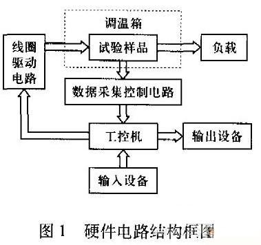 電磁繼電器壽命加速試驗裝置包括試驗控制柜、負載、自動調溫箱(提供加速應力)3部分,其中控制柜由工控機、數(shù)據(jù)采集控制電路、線圈驅動電路組成,是設計的主要內容。硬件電路結構框圖 如圖1所示。