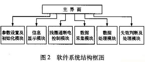 本系統(tǒng)應用軟件由6個功能模塊組成:參數(shù)設置及初始化模塊、信息顯示模塊、線圈通斷電控制模塊、數(shù)據(jù)采集模塊、數(shù)據(jù)處理模塊、失效判定及處理模塊,其結構框圖如圖2所示。