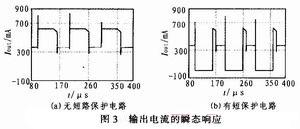 圖3(b)所示曲線的仿真條件與圖3(a)的條件一樣。仿真結(jié)果表明當輸出發(fā)生短路時(即負載為0),輸出電流被限制為O,即功率MOS管被完全關斷,同時表明系統(tǒng)具有自動恢復的特點,即負載短路消除后,系統(tǒng)恢復正常工作。