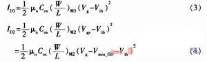 接下來將分析VM2、VM3和VM4組成的網(wǎng)絡如何確保Vmin_OD大于0。分析電路可知,VM2、VM3工作在飽和區(qū),VM4工作在線性區(qū),因此ID3>ID4,ID4=ID2。