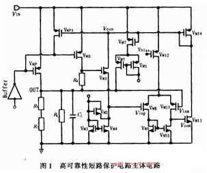 同時當短路發(fā)生時(即Vcon信號為低電平),VM7管正常工作,VM5管將導通,有一定的電流流向0UT端;因此一旦短路消除(即0UT端接有負載電阻),VM5管將對負載電容和負載電阻組成的并聯(lián)RC網(wǎng)絡充電,0UT端電壓升高,Vcon信號將變?yōu)楦唠娖?,電路自動恢復正常狀態(tài)。