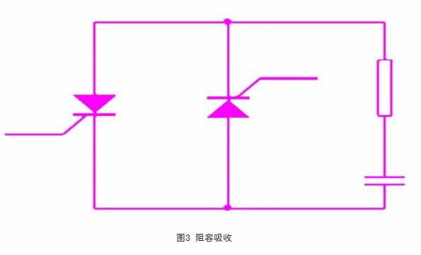 在晶閘管兩端并聯(lián)r-c阻容吸收回路,如圖3所示,利用電容吸收過壓。其實質就是將造成過電壓的能量變成電場能量儲存到電容中,然后釋放到電阻中消耗掉。