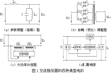 由于我國交流電網(wǎng)的電壓波動較大,特別是邊遠農(nóng)村地區(qū),交流穩(wěn)壓電源已成為許多電子設備不可缺少的供電裝置[1]。按照工作原理,交流穩(wěn)壓電源可分為參 數(shù)調(diào)整(諧振)型[2]、自耦(變比)調(diào)整型[3]、大功率補償型[4、5]和開關型[6、7]等四種類型,其典型電路如圖1所示。