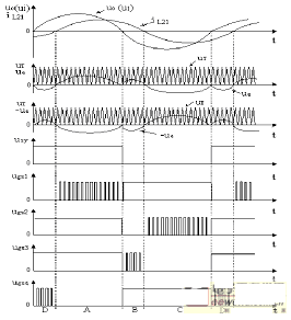 新穎的Buck-Boost型正弦交流穩(wěn)壓器,采用具有輸入電壓極性和工作模式選擇的電壓瞬時值反饋控制方案,其感性負載時的原理波形如圖3所示。圖中 iL21為高頻儲能式變壓器的副邊電感電流iL2的基波分量。通過調(diào)節(jié)PWM信號的占空比,即可實現(xiàn)正弦交流穩(wěn)壓器輸出電壓的穩(wěn)定。輸出濾波電容與負載的 并聯(lián)阻抗等效為感性、容性、阻性時,正弦交流穩(wěn)壓器的工作模式順序分別為A-B-C-D、D-C-B-A、A-C。