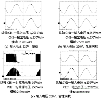 不同輸入電壓和負載時,500VA 220V±10%50Hz/220V50Hz Buck-Boost型正弦交流穩(wěn)壓器的原理試驗波形,如圖4所示。原理試驗結果表明:Buck-Boost型正弦交流穩(wěn)壓器工作時存在四種DCM模式 A、B、C、D;輸出電壓波形THD含量低;負載適應能力強;穩(wěn)壓性能好。試驗結果與理論分析一致。