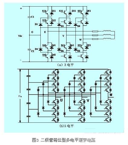 1977年德國學(xué)者h(yuǎn)oltz首次提出了利用開關(guān)管來輔助中點(diǎn)箝位的三電平逆變器主電路,1980年日本的a·nabae等人對(duì)其進(jìn)行了發(fā)展,提出了二極管箝位式逆變電路。圖3(a)為二極管箝位逆變電路,它具有2個(gè)電容,能輸出3電平的相電壓。