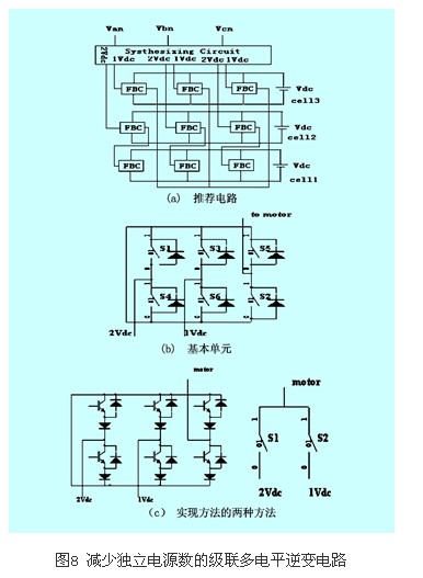 圖8(a)為推薦的三相級(jí)聯(lián)逆變主電路,它只有三個(gè)獨(dú)立直流電源,每相根據(jù)各開關(guān)的不同組合可以產(chǎn)生+2vdc、-2vdc、+vdc或-vdc電平的電壓。圖中fbc為基本的h橋逆變單元。為了避免各直流電源短路,增加了一組合成電路(synthesizingcircuit)。合成電路基本模式如圖8(b)所示,具體實(shí)現(xiàn)由圖8(c)所示的兩種方法完成,s1和s2為雙向開關(guān)。