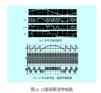 本方法主要針對(duì)非對(duì)稱混聯(lián)逆變電路。為了實(shí)現(xiàn)輸出電壓波形的連續(xù)調(diào)幅,需要對(duì)多電平電路進(jìn)行pwm控制。同時(shí)為了降低脈沖階躍幅度帶來的電磁干擾,連續(xù)調(diào)幅時(shí)產(chǎn)生的脈沖不超過1v。圖14為23型3級(jí)h橋非對(duì)稱混聯(lián)逆變電路(三個(gè)級(jí)聯(lián)單元的直流電壓比為1:2:4)的混合pwm調(diào)制方法示意圖。首先對(duì)電壓為2v和4v單元按圖14(a)中的iii、iv波形進(jìn)行驅(qū)動(dòng),然后將i中正弦調(diào)制波和iii、iv波形相減,得到1v單元的調(diào)制波ii。再用ii和三角載波進(jìn)行調(diào)制,形成1v單元的pwm驅(qū)動(dòng)波形,如圖14(b)所示。顯然,該法只對(duì)1v單元進(jìn)行了pwm調(diào)制,因此在選擇器件時(shí),就可以在2v和4v單元使用低頻大功率器件,如igct;而在1v的pwm單元采用高頻小功率器件。