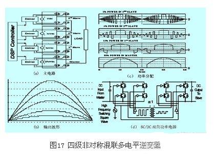 有些學(xué)者為非對(duì)稱混聯(lián)多電平逆變電路提出了主從逆變單元的概念。主逆變單元(master)就是串聯(lián)連接的逆變器中,直流電壓最高的單元,它承擔(dān)級(jí)聯(lián)逆變器大多數(shù)的功率,通常由gto、igct完成,同時(shí)通過dc/dc雙向功率電源向從逆變單元(slave)供電。其它的逆變單元稱為從逆變單元,直流電壓較低,只負(fù)責(zé)完成自己的逆變?nèi)蝿?wù)。圖17所示為(a)(b)(c)(d)分別為4級(jí)連接81電平的逆變器主電路、輸出波形、功率分配情況及dc/dc雙向功率電源。