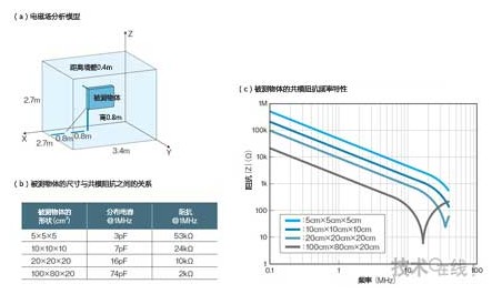 利用尺寸各異的4種對象物進行了電磁場解析模擬,計算出了從人工電源網絡觀察被測物體時的共模阻抗(a)。根據(jù)結果可知,形狀越大,屏蔽室基準面與被測物體的分布電容越大,共模路徑的阻抗就越低(b)。另外,頻率越高,共模阻抗越低(c)。