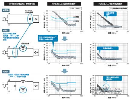 作為噪聲水平較高的共模噪聲對策,①安裝了標準的共模扼流圈(3mH)。這樣做雖然共模噪聲大幅衰減,但差模噪聲并沒有衰減,因此低頻帶范圍的電磁噪聲依然高于規(guī)定值。