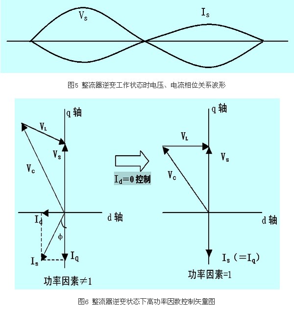 我們希望整流器不論是工作在整流狀態(tài)還是逆變狀態(tài)其功率因素都等于1.0,因此整流器工作在逆變狀態(tài)時(shí),只要做到is與vs的相位是反相的,功率因數(shù)同樣可控制在1.0,這時(shí)能量是往電網(wǎng)方向流動(dòng)的。如圖5和圖6所示。