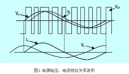 功率因數(shù)控制到1.0實(shí)際上就是設(shè)法使電源電流is與電壓vs同相位。因此,只要讓調(diào)制正弦參考波落后電網(wǎng)電壓vs一個(gè)角度,整流器網(wǎng)側(cè)輸出的PWM電壓vcp的基波分量vc落后于vs,使電流is與電壓vs同相,整流器工作在整流狀態(tài),而且功率因數(shù)控制在1.0,如圖3所示。