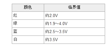 LED具有一般硅二極管的類似特性,在正負極之間施加電壓。當外加電壓達到一個臨界值,LED中產(chǎn)生電流,開始發(fā)光。當電壓超過這個臨界值時,電流急劇增加。白色LED的臨界電壓值約3.5V。紅色、綠色、藍色的LED臨界電壓值如表1所示。