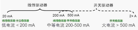 如今在市場上典型的LED驅動器包括兩類,即線性驅動器和開關驅動器;大概的適用范圍見圖5.如電流大于500mA的大電流應用采用開關穩(wěn)壓器,因為線性驅動器限于自身結構原因,無法提供這樣大的電流;而在電流低于200mA的低 電流應用中,通常采用線性穩(wěn)壓器或分離穩(wěn)壓器;而在200至500mA的中等電流應 用中,既可以采用線性穩(wěn)壓器,也可以采用開關穩(wěn)壓器。