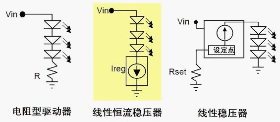 例如在采用DC-DC電源的LED照明應用中,可以采用的LED驅動方式有電阻型、線性穩(wěn)壓器及開關穩(wěn)壓器等,基本的應用示意圖見圖7。