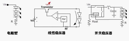 開關穩(wěn)壓器的能效高,且提供極佳的亮度控制。線性穩(wěn)壓器結構比較簡單,易于設計,提供穩(wěn)流及過流保護,且沒有電磁兼容性(EMC)問題。