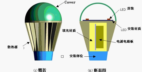 要避免電子設備的發(fā)熱有多種方法。比如,加散熱器,在熱源周圍安置能提供冷氣的風扇。前者是通過增加散熱面積,來增加散熱的通道,后者是使熱不在熱源周圍聚集。但是,正如圖1 LED燈的概括圖所示,LED封裝時不能直接連接散熱器,也沒有安裝風扇的位置。而且內部電源電路板也會產(chǎn)生熱量,因此LED燈的散熱問題可以說是一個非常棘手的問題。這樣,如何有效使用LED安裝材質和散熱器就變得很重要。