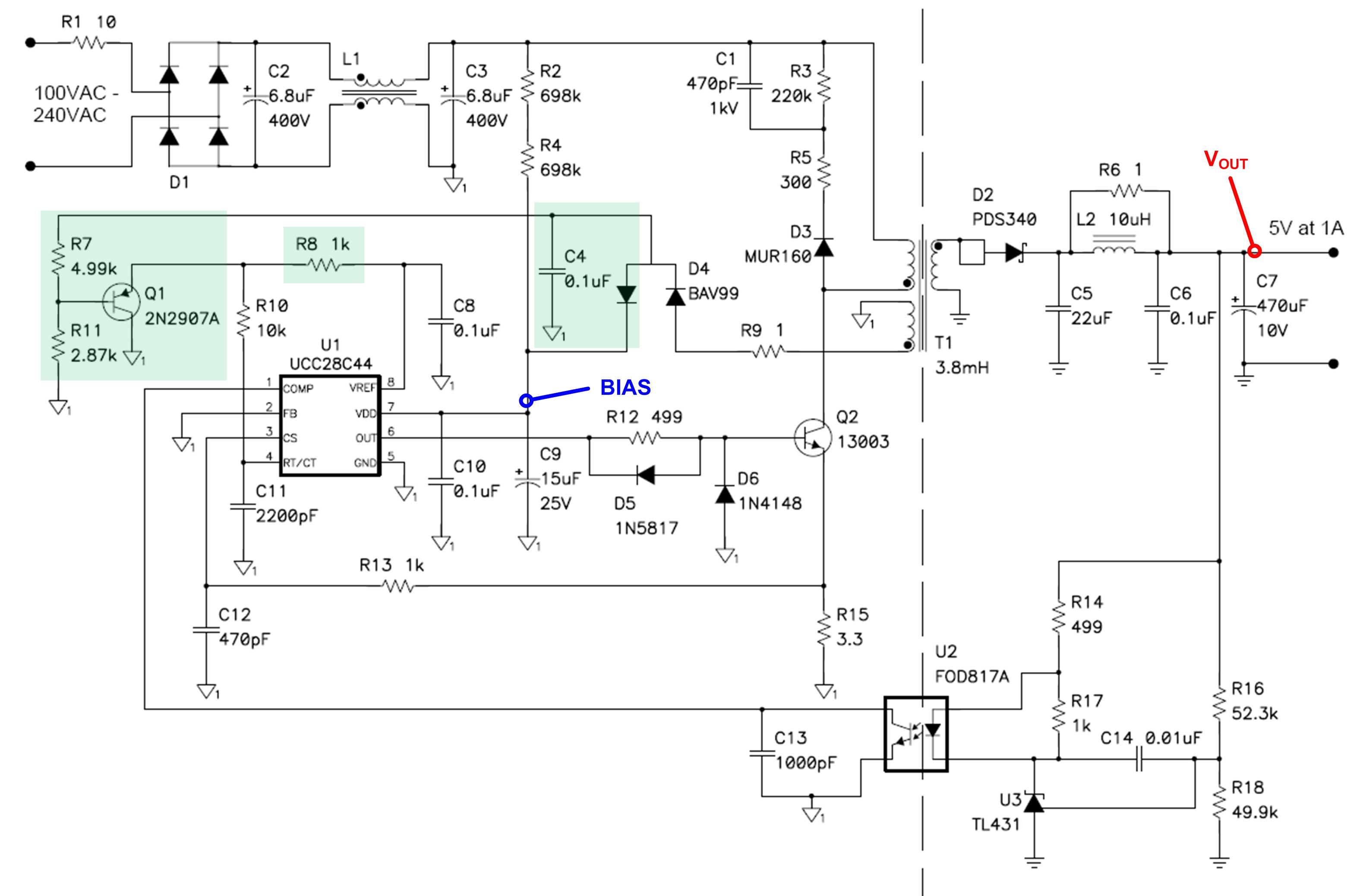 圖2顯示了移動(dòng)設(shè)備充電器所使用的一個(gè)5V/5W非連續(xù)反向電源的原理圖。在范例中,我們使用了UCC28C44控制器,它是大多數(shù)經(jīng)濟(jì)型峰值電流模式控制器的代表,擁有功率限制功能。在非連續(xù)反向結(jié)構(gòu)中,如果忽略效率影響,可使用方程式1計(jì)算負(fù)載功率(P)的大小。