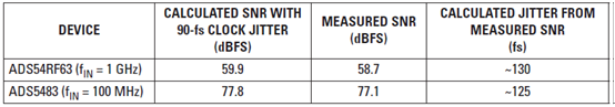 通過(guò)在時(shí)鐘輸入通路中安裝低噪聲 RF 放大器,兩個(gè)數(shù)據(jù)轉(zhuǎn)換器重復(fù)進(jìn)行了高輸入頻率的 SNR 測(cè)量,其結(jié)果如表 5 所示。我們可以看到,測(cè)得 SNR 和預(yù)計(jì) SNR 匹配的非常好。使用下面的方程式 5,計(jì)算得到的時(shí)鐘抖動(dòng)值在 90-fs 時(shí)鐘抖動(dòng)的 5 fs 以內(nèi),其結(jié)果通過(guò)相位噪聲測(cè)得推導(dǎo)得出。