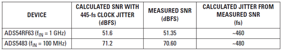 利用調(diào)節(jié)后的相位噪聲曲線圖,計(jì)算得抖動(dòng)較好地匹配了 SNR 測(cè)量結(jié)果,其在 ADS54RF63 和 ADS5483 的 10 到 30 fs 范圍內(nèi)(參見(jiàn)表 8)。考慮到在第三諧波周圍可能存在相位噪聲的較小時(shí)鐘抖動(dòng)影響,該計(jì)算得 SNR 只是一種非常接近的估算結(jié)果。