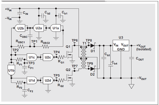 如果應(yīng)用要求 2 kV 以上的隔離電壓、60% 以上的轉(zhuǎn)換器效率或者標(biāo)準(zhǔn)組件可靠的有效性,那么分立設(shè)計(jì)就是一種能夠替代集成組件的低成本方案。分立 DC/DC 轉(zhuǎn)換器設(shè)計(jì)的缺點(diǎn)是需要做大量的工作——選擇穩(wěn)定的振蕩器結(jié)構(gòu)和先斷后通電路,選擇可以通過(guò)標(biāo)準(zhǔn)邏輯門(mén)有效驅(qū)動(dòng)的MOSFET,適宜實(shí)施溫度和長(zhǎng)期可靠性測(cè)試。所有這些努力都要花費(fèi)時(shí)間和資金。因此,在倉(cāng)促進(jìn)行這樣一個(gè)計(jì)劃以前,設(shè)計(jì)人員應(yīng)該考慮到下列事項(xiàng):集成組件通常已通過(guò)溫度測(cè)試,并且擁有其他工業(yè)資質(zhì)。這些組件不僅僅是最可靠的解決方案,而且還擁有較快的上市時(shí)間。