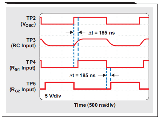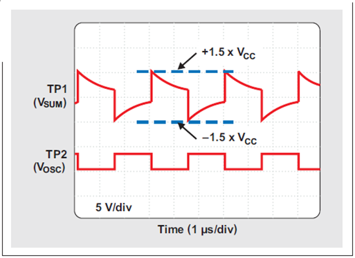 著名的三反相門(mén)振蕩器由 U1a、U2a 和 U2b 組成,選擇它是因?yàn)樗诠╇姴▌?dòng)方面較為穩(wěn)定。通過(guò)一個(gè) 100-pF 陶瓷電容器(COSC)和兩個(gè) 10-kΩ 電阻器(ROSC1 和 ROSC2),它的正常頻率被設(shè)定為 330kHz。在 3.0-V 到 3.6-V 電源電壓波動(dòng)范圍內(nèi),振蕩器擁有接近 50% 的占空比,以及低于 ±1.5% 的最大頻率波動(dòng)。圖 2 顯示了 ROSC1 和 ROSC2 (TP1) 相加點(diǎn)和振蕩器輸出 (TP2) 處的波形。所有電壓均為參考電路基準(zhǔn)電壓測(cè)得。[page]
