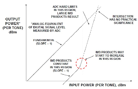 然而,輸入信號(hào)一旦達(dá)到某種水平,輸出信號(hào)就會(huì)開始軟限制或壓縮。這里一個(gè)相關(guān)參數(shù)是1 dB壓縮點(diǎn)。這就是輸出信號(hào)從一個(gè)理想的輸入/輸出傳遞函數(shù)壓縮1 dB的點(diǎn)。在圖2中,該點(diǎn)處于理想斜率= 1線變成虛線與實(shí)際響應(yīng)表現(xiàn)出壓縮跡象(實(shí)線)之間的區(qū)域中。