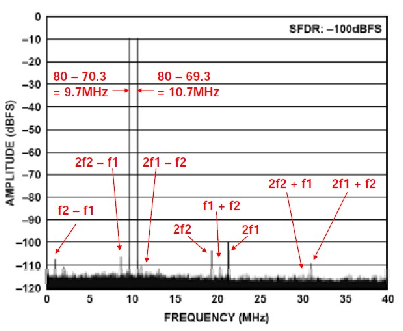 通信應(yīng)用通常需要測量雙音和多音SFDR.信號(hào)音數(shù)量越多,越接近蜂窩電話系統(tǒng)(如AMPS或GSM)的寬帶頻譜。圖4所示為AD9444 14位80-MSPS ADC的雙音交調(diào)性能。兩個(gè)輸入音的頻率分別為69.3 MHz和70.3 MHz,位于第二奈奎斯特區(qū)。