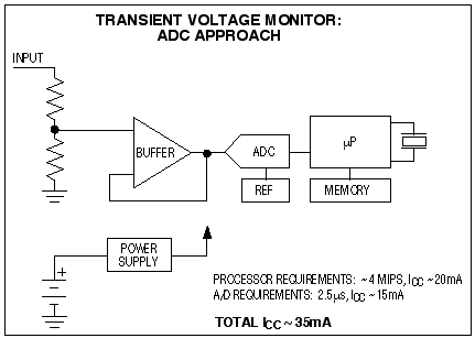 如果軟件比較具有高效編碼并且ADC無需處理器干預,系統(tǒng)每次采樣可執(zhí)行少于10條指令,這就要求處理器具有4MIPS的能力。這種執(zhí)行能力并不適合采用電池供電(圖1)。需要考慮用模擬方法對輸入瞬態(tài)偏離進行響應,用以替代連續(xù)跟蹤方案?! ?br />