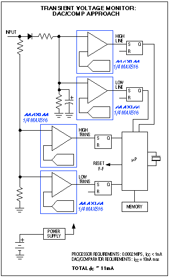 在這種情況下,DAC/比較器替代方案提供了幾個明顯優(yōu)勢。需要4個DAC和4個比較器(或一片MAX516),后面連接一個4路設(shè)置/復位觸發(fā)器。一組DAC/比較器/FF監(jiān)測高瞬態(tài)電壓,一組監(jiān)測低瞬態(tài)電壓,一組用于監(jiān)測電網(wǎng)跌落,一組用于監(jiān)測浪涌(圖2)。瞬態(tài)電壓直接耦合到比較器,連接到電壓跌落和浪涌監(jiān)測比較器的輸入首先要進行整流和濾波,以獲得電網(wǎng)電壓的平均值。可在軟件中調(diào)整到合適的rms.