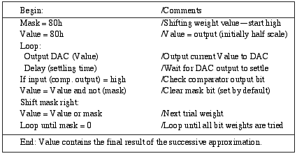 在逐次逼近ADC中,內(nèi)部DAC的位模擬系列二進制重量,比較器輸出模擬天平指示。驅(qū)動權(quán)位處理的邏輯保存在封裝好的ADC的逐次逼近寄存器(SAR)或者控制DAC/比較器電路的處理器軟件子程序,該子程序可由不到20行的代碼來實現(xiàn)。