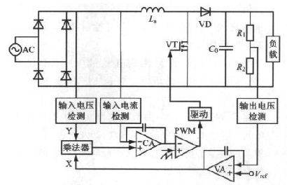 工作原理:APFC主電路的輸出電壓經(jīng)電阻分壓后與基準(zhǔn)電壓相比較,誤差值輸入到VA;VA 輸出信號(hào)X與輸入電壓檢測(cè)信號(hào)Y一起輸入乘法器,經(jīng)過(guò)平均化處理、放大、比較后,再經(jīng)過(guò)PWM 比較器加到柵極驅(qū)動(dòng)器,產(chǎn)生對(duì)開關(guān)管VT的控制信號(hào),從而使電感Ls上的電流(即輸入電流)平均值始終跟蹤模擬乘法器輸出的半正弦信號(hào),即跟蹤了輸入電壓波形,并實(shí)現(xiàn)了輸入電流正弦化,使功率因數(shù)接近1,達(dá)到校正功率因數(shù)的目的?! ?br />